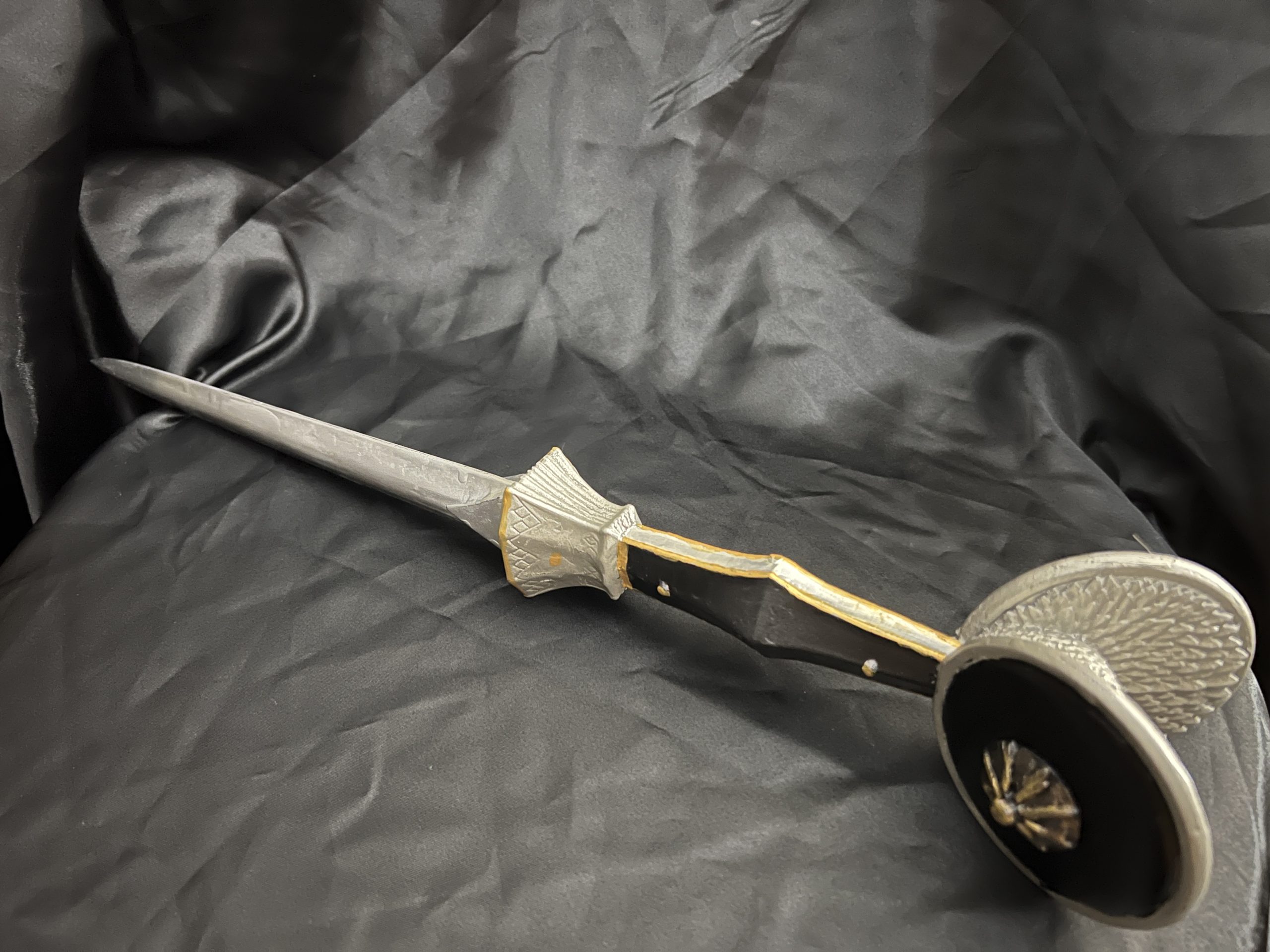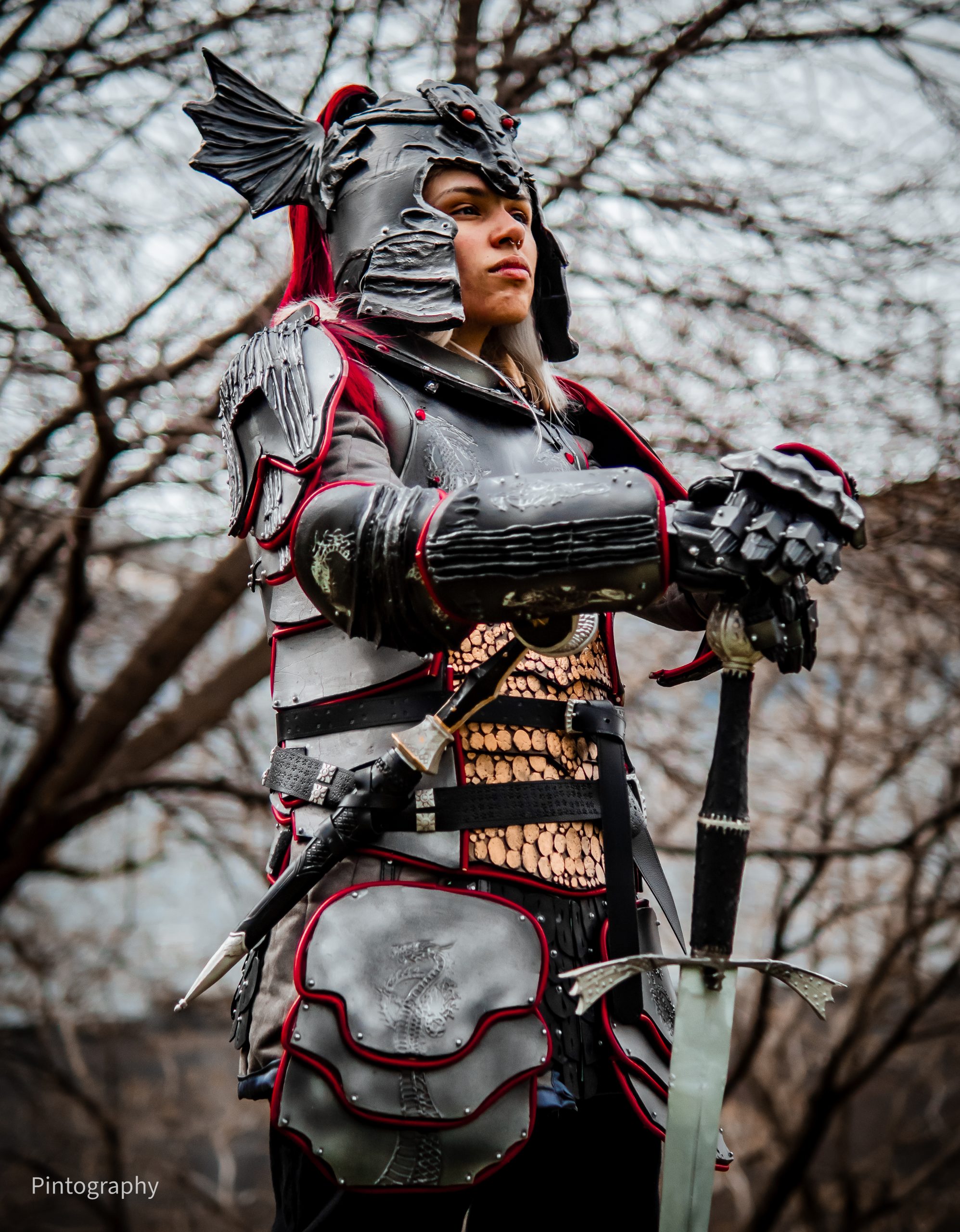 I drafted a good majority of the patterns to make this cosplay. The entire armor set and shield is made from EVA foam, with every individual chest armor scale being entirely hand patterned, cut out, textured, painted and glued on. From there, the sword and dagger were 3D printed, pants and tunic sewed, wig styled, shoes weathered and scale skirt also individually cut out and assembled. I used puffy paint for the elevated dragon details through the armor and embossed my belts.